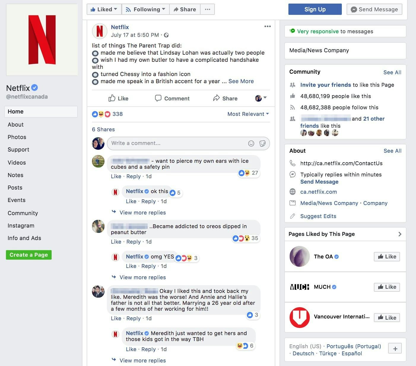 Netflixis a great example of a brand on Facebook that regularly engages with customers. Their comments are almost always hilarious which makes you want to engage with the brand.