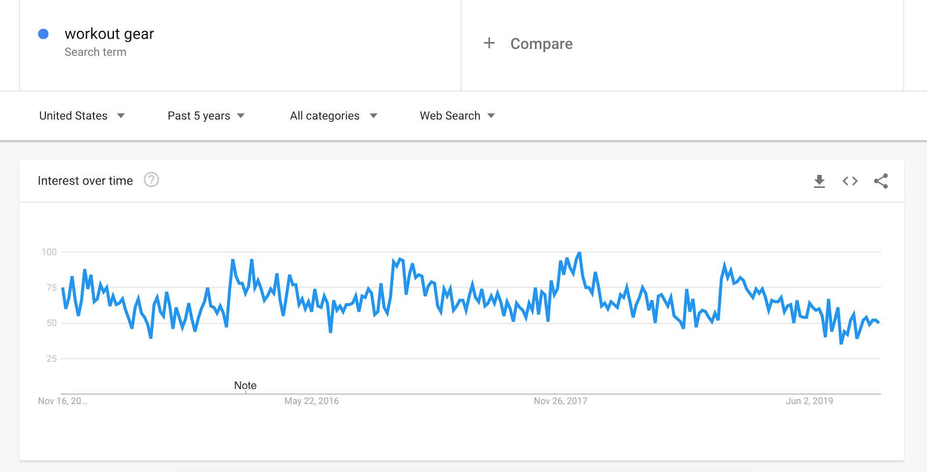 正如你所看到的,“健身装备”一词的搜索量在每年的12月到1月期间持续飙升。