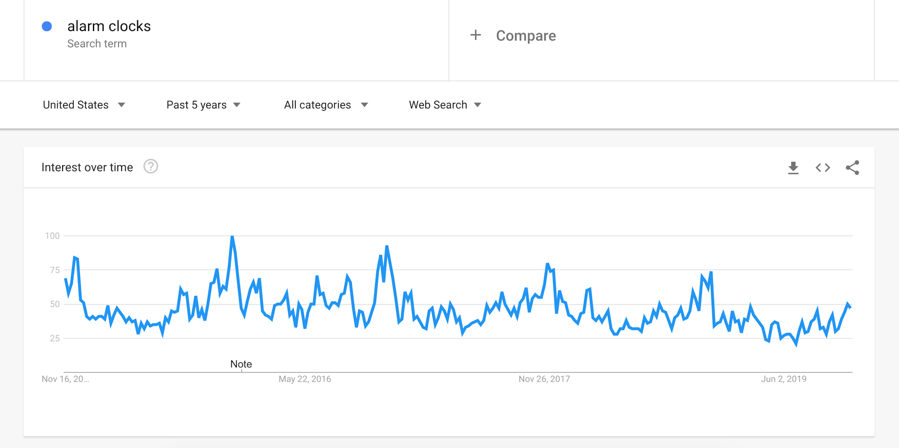 在过去的五年里,美国人搜索闹钟的次数减少了一个很少,但每年12月这些产品的搜索量都会出现峰值。