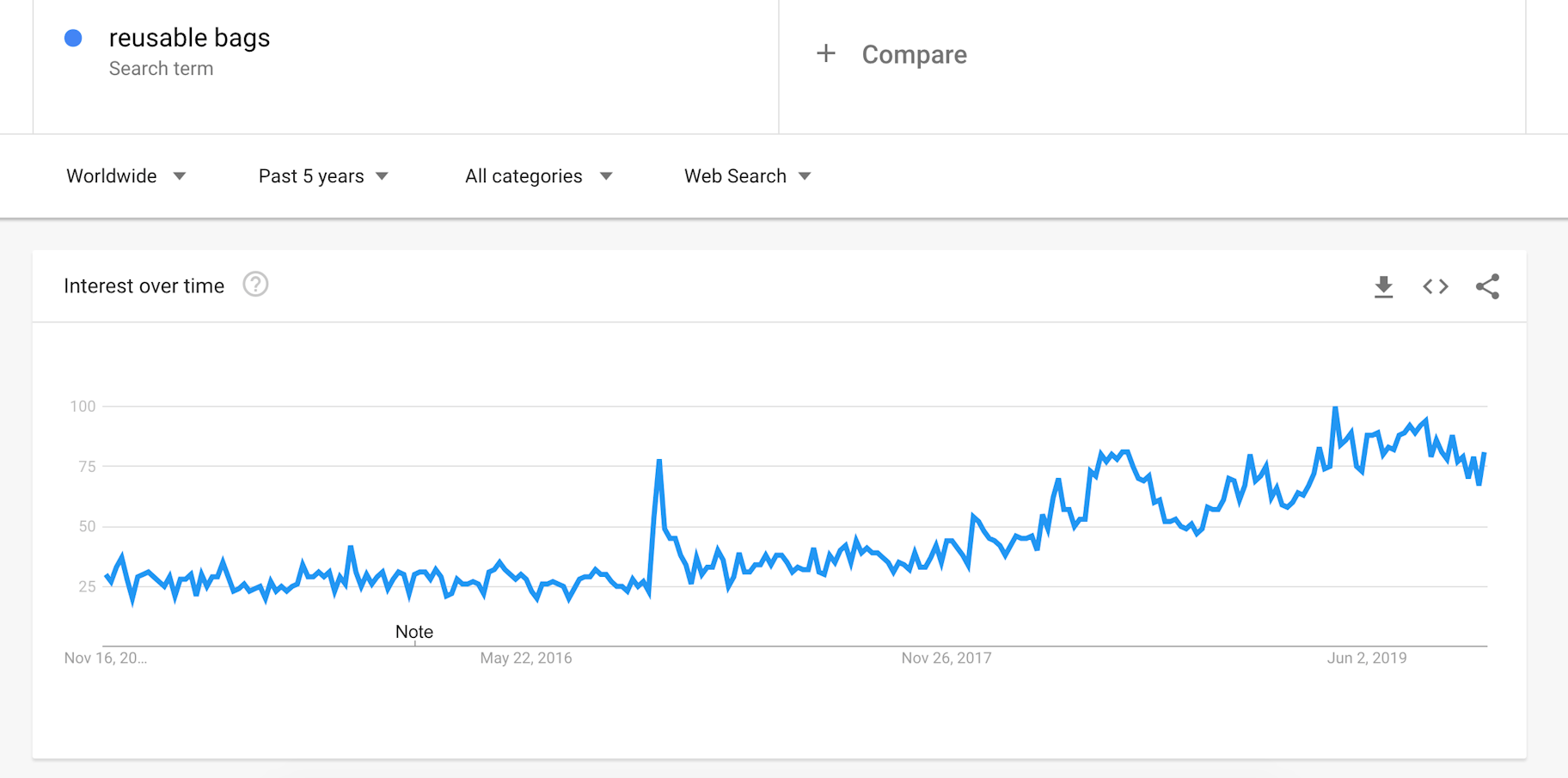 看看在全球范围内搜索在过去5年的“可重复使用的袋子”。