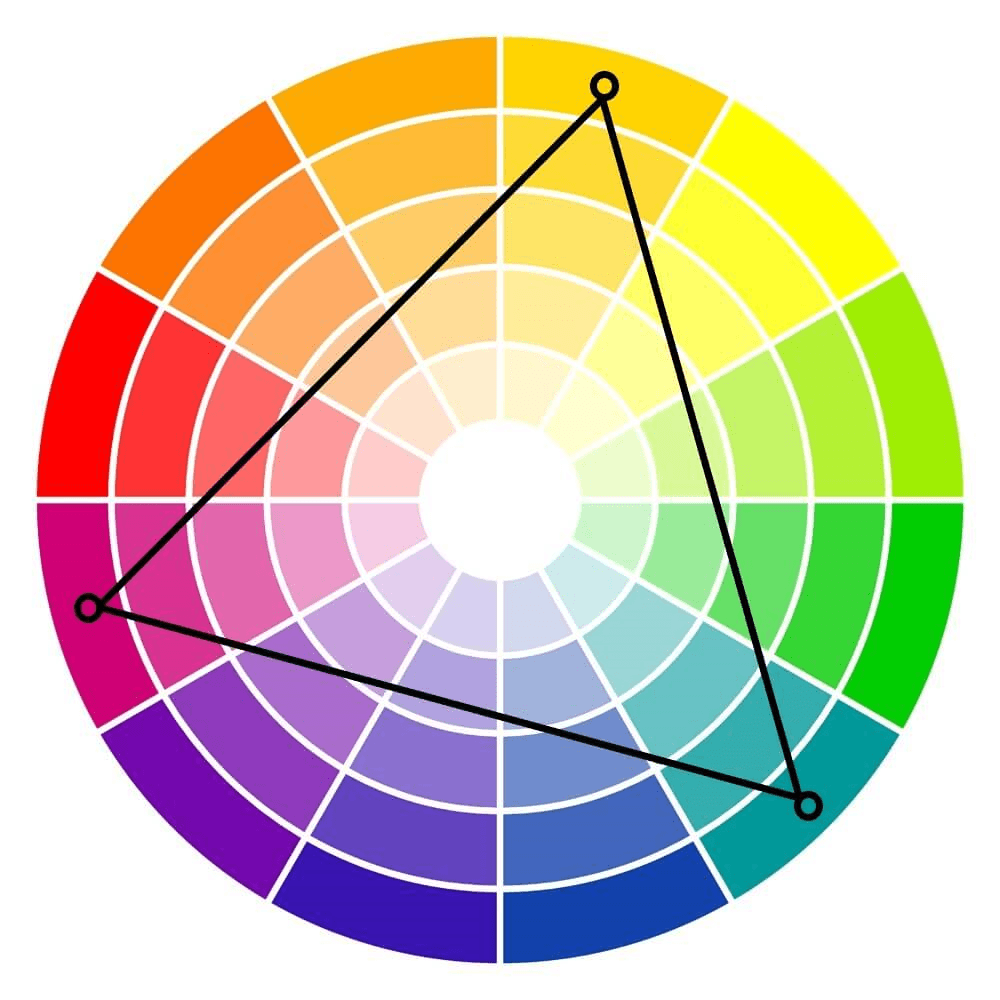 三色配色方案是分裂互补配色方案的变体。这幅构图中的颜色在色轮上的间隔是相等的。取一个等边三角形,把它放在色轮上。每个点上的颜色聚集在一起形成三色方案。