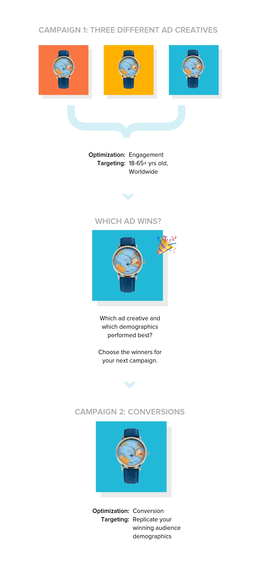 在进行测试以了解哪些受众和销售策略有效之后,克里斯创建了第二次活动。这一次,他将优化他的广告活动以获得“转化率”,并从他之前最成功的广告中复制广告创意和受众统计数据。