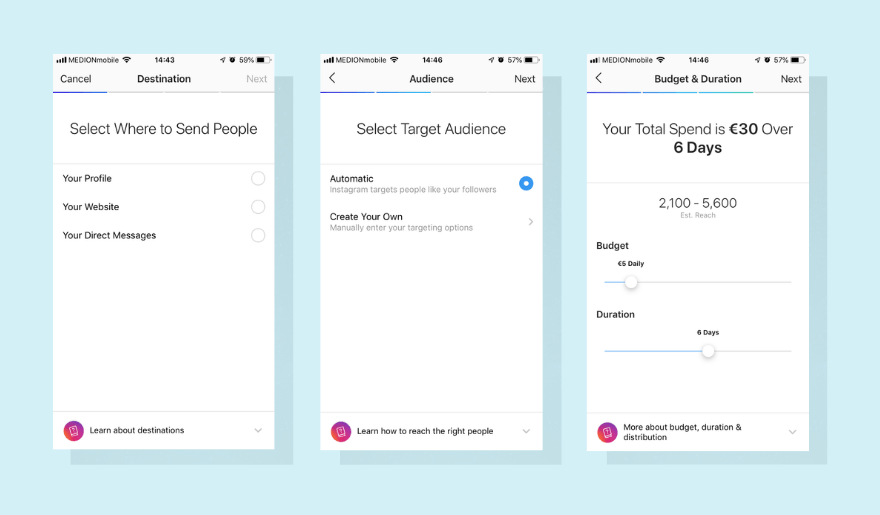 一旦你在Instagram上建立了一个商业档案,你可以决定你想花多少钱,你想让你的广告在哪里被看到,以及你想让它们运行多长时间。Instagram提供了各种各样的目标选项,所以你可以选择最适合你的业务需求的。