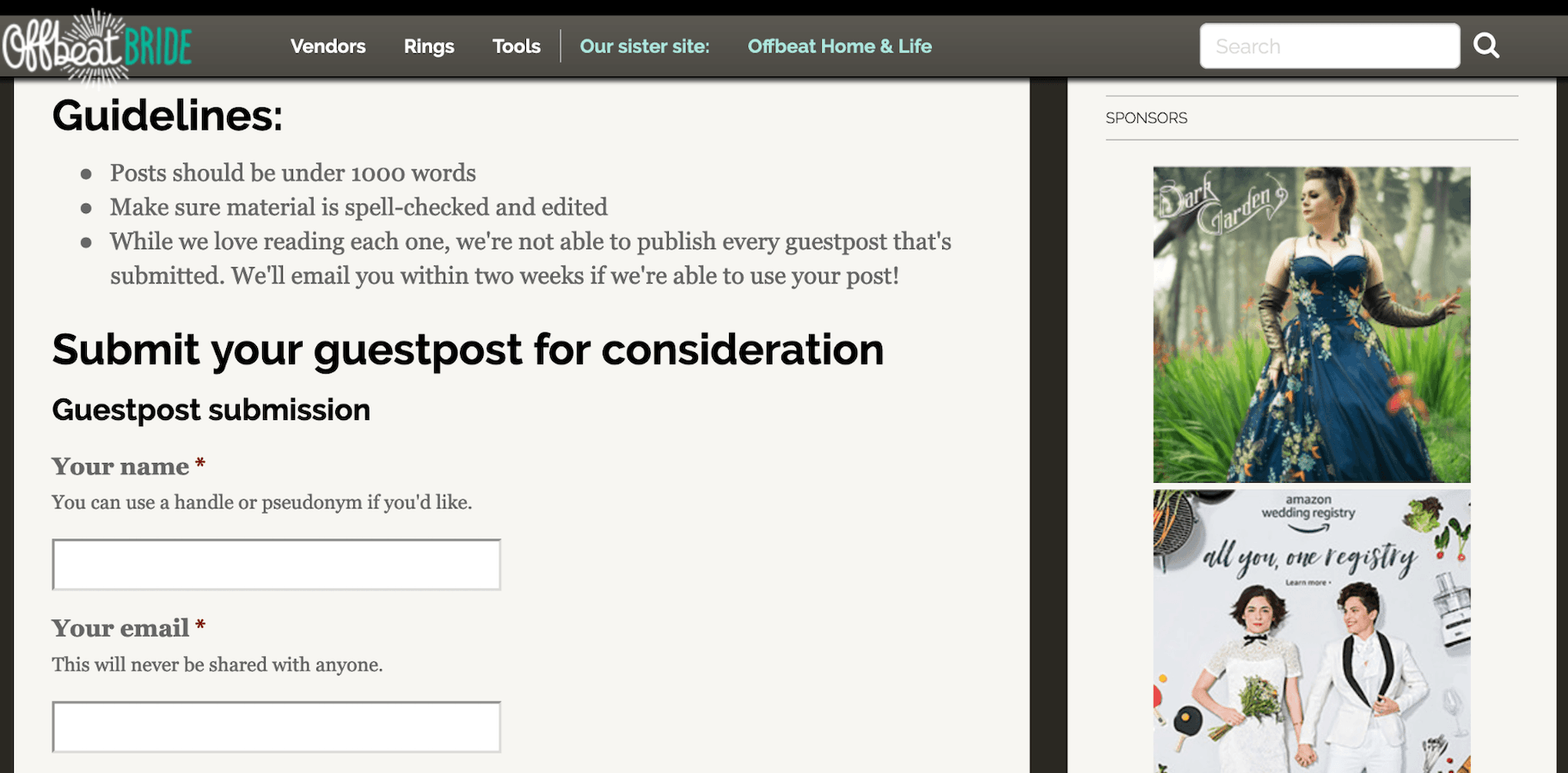 记住要仔细遵循访客发帖指南。标新立异的新娘,例如,有一个详细的页面和表单,用户可以提交他们的宣传:
