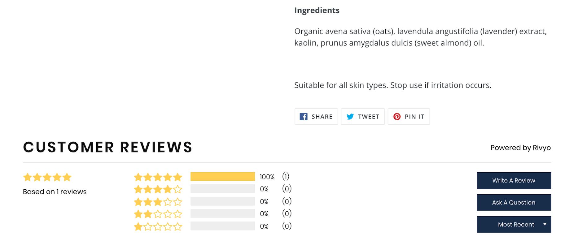 护肤品牌说话在产品页面的产品描述下方和客户评论上方有社交分享按钮。