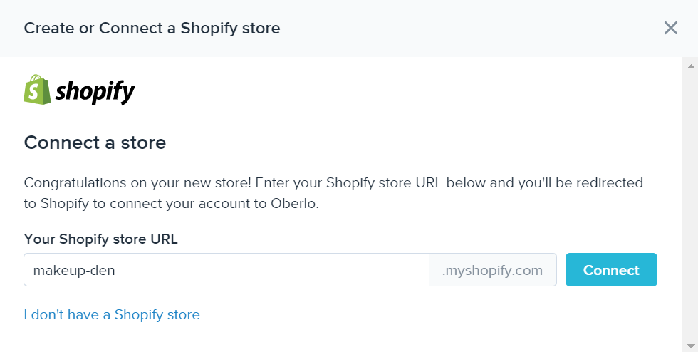 - 回到奥伯洛的窗口。将有一个新的弹出窗口,要求您输入商店的URL。从Shopify窗口复制并粘贴URL。这将是您输入的商店名称,只是单词之间使用破折号而不是空格。