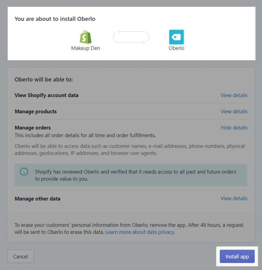- 然后你会被带到你的Shopify仪表板上,并被要求将Oberlo安装到你的Shopify中。向下滚动并单击“安装应用程序”。
