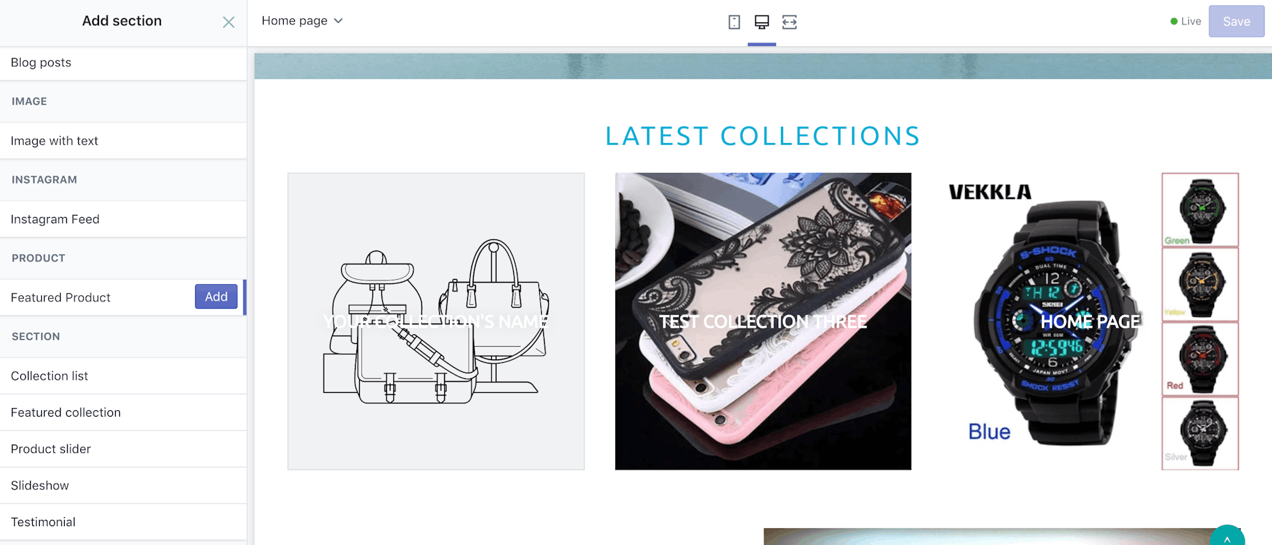 如果您导航到您的Shopify管理区域>主题>自定义>特色产品,您可以选择特色产品的集合。