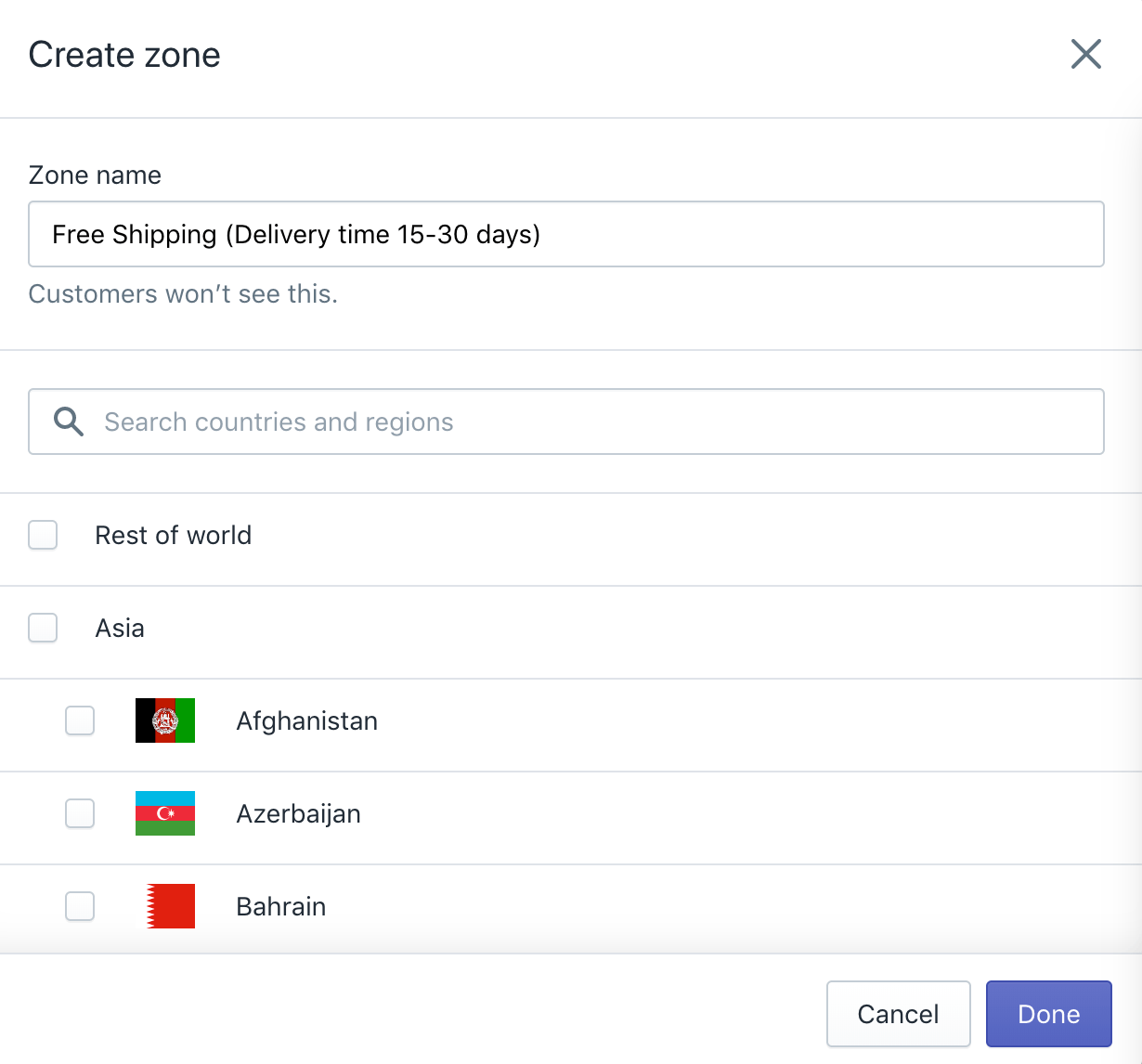您可以添加您计划运送到的国家。如果你同意运送到其他地方,就加上“世界其他地方”。