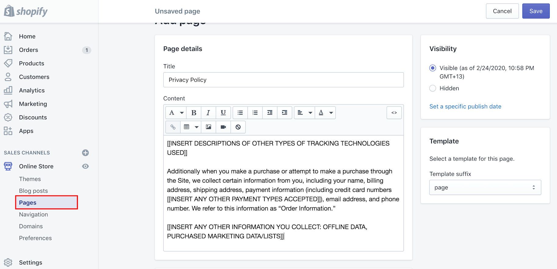 就像你在Shopify上制作的任何页面一样,你必须将这些添加到网站的页眉或页脚,否则客户无法在没有直接链接的情况下访问它们。
