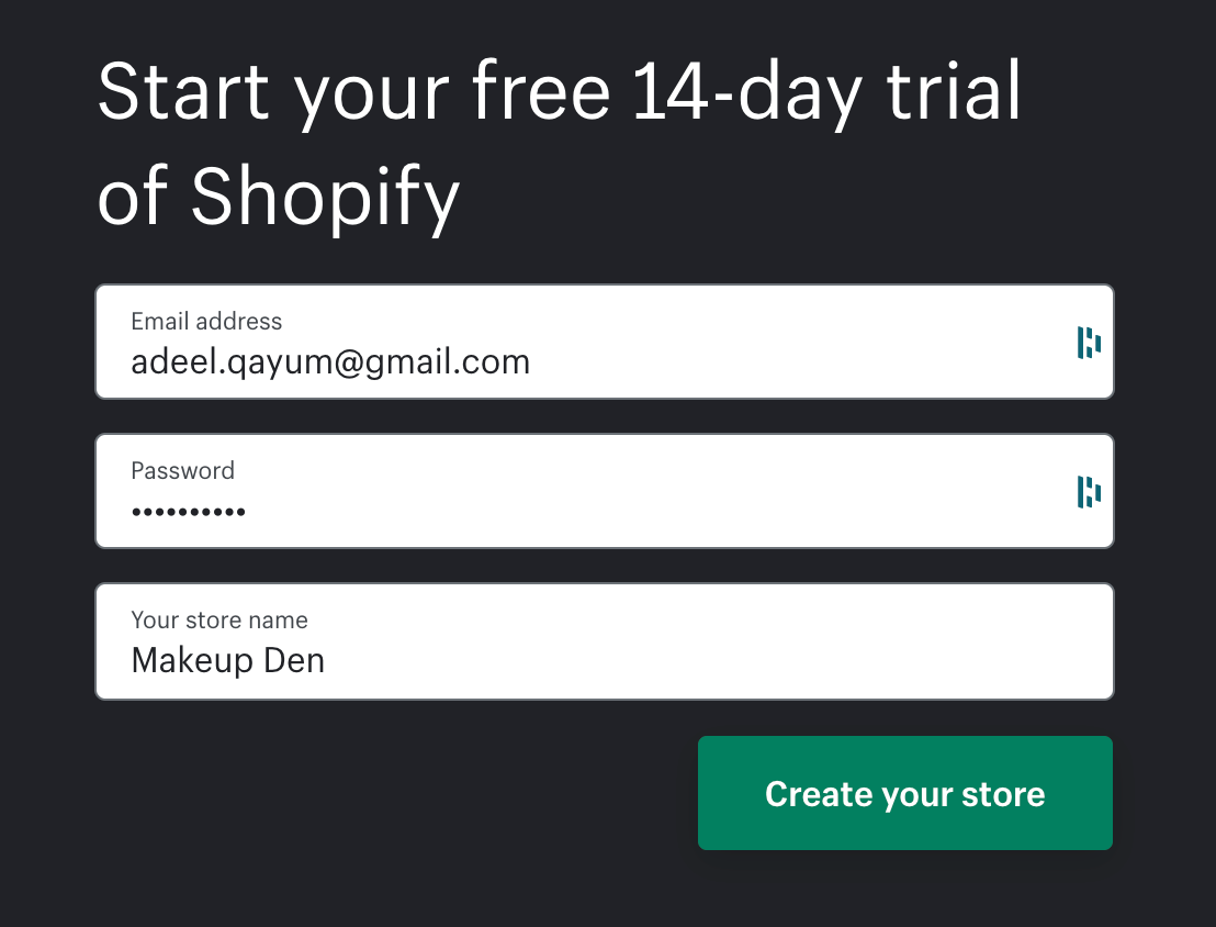 - 你会自动转到Shopify.com。点击主页右上角的“开始免费试用”。输入您的电子邮件,创建密码和企业名称,然后点击“创建您的商店”。