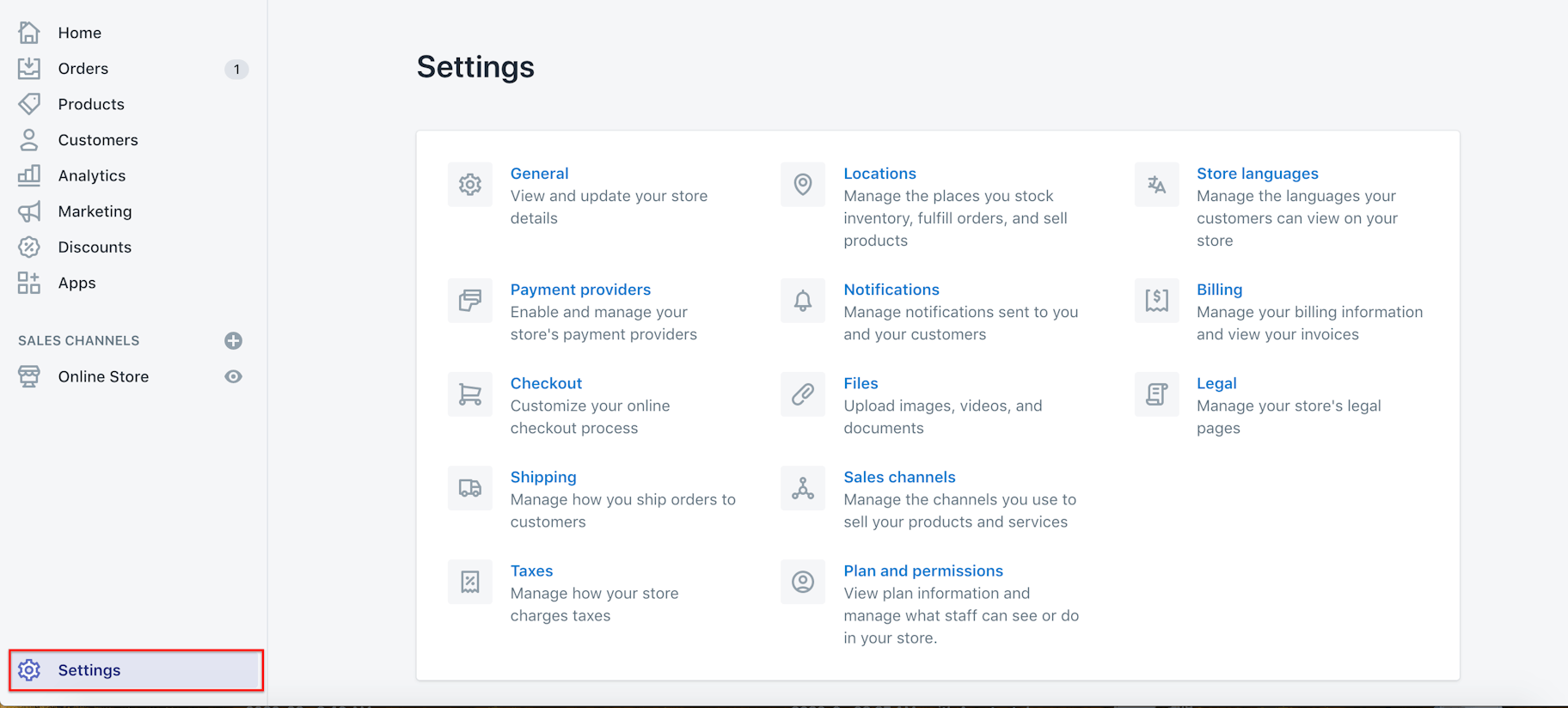 你需要设置一些东西来让商店顺利运行。让我们浏览一下设置。在仪表板的左下角,点击带有齿轮图标的“设置”按钮。