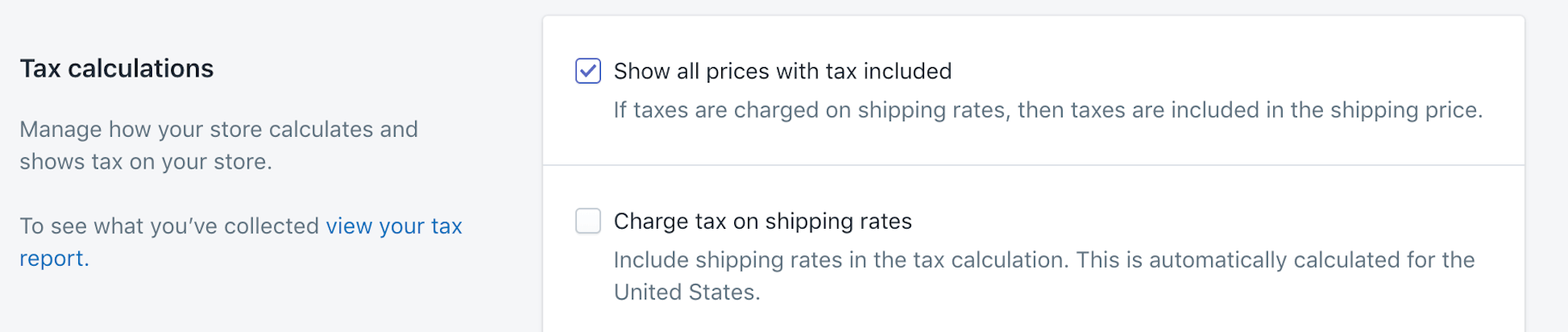 然后,转到“税收”。如果您只想在价格中包含税费,或者如果您想让客户根据他们购买的地点支付税费,请选择。在美国,这是基于他们的州/县/城市。在其他地方,这可能是基于他们的国家。