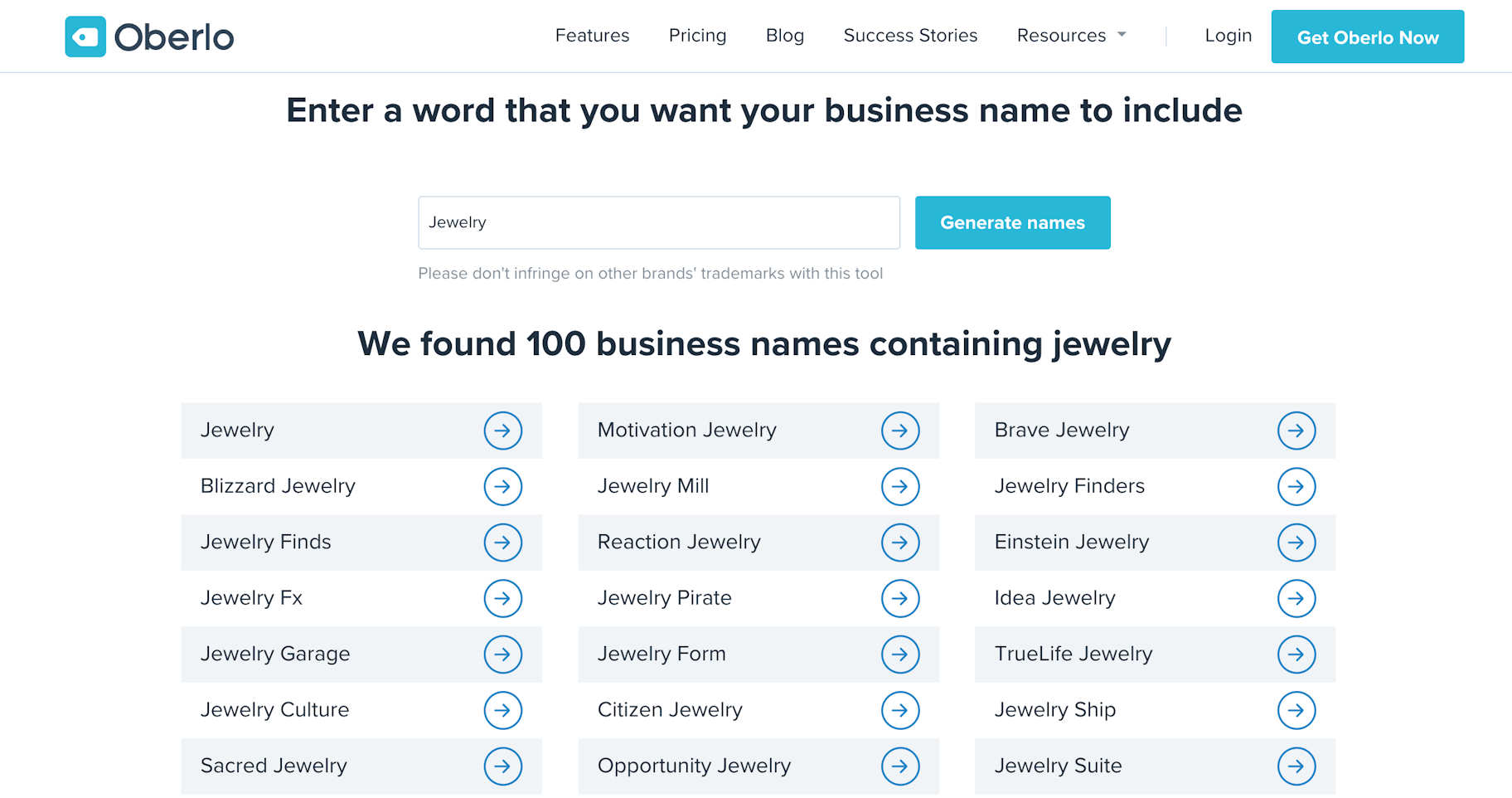提供dropshipping商店名称的一个有用工具是Oberlo企业名称生成器。