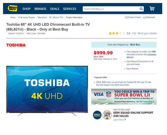 百思买的销售项目在产品列表中很显眼,因为它们的价格是亮红色的。它还列出了顾客如果选择购买该商品将节省多少钱。一旦客户点击产品页面,他们还会看到针对该产品的特别优惠。这让顾客从他们的购买中获益更多。