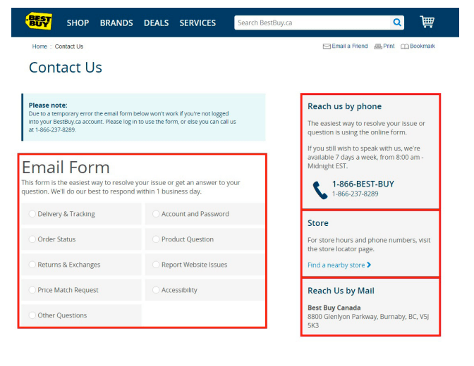 百思买的“联系我们”页面允许客户以多种方式联系他们。客户可以通过电子邮件、电话、亲自或通过邮件与百思买联系。拥有多种沟通方式使客户能够以他们感到最舒适的方式解决问题。