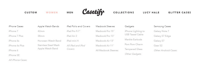 Casetify以一种很棒的方式组织产品。他们允许客户选择基于手机或平板电脑型号的产品。他们也有系列产品,让顾客看到类似风格的产品,如大理石、闪光等。
