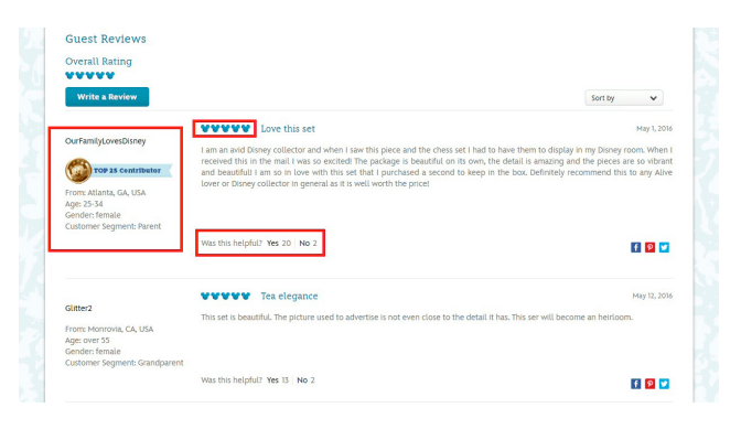 接下来,迪士尼的评论部分继续让这个品牌脱颖而出。他们没有使用明星,而是选择使用吉祥物米奇的剪影来保持品牌的一致性。评论者能够创建独特的用户名,并分享一些对客户有价值的个人信息。你将知道评论产品的顾客的年龄、性别、地点和客户群。这些额外的信息有助于确认产品是否适合你。