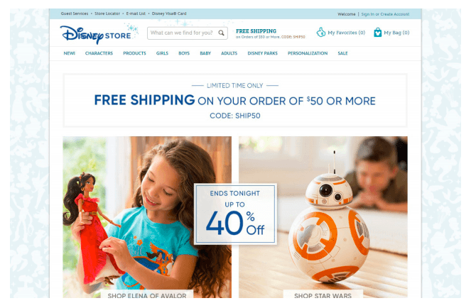 当你第一次访问迪士尼商店网站时,你可以立即看到许多营销策略在起作用。只要扫一眼,你就能看到他们使用的紧急策略,免费送货和促销优惠。使用这些策略,无论是在主页上还是在产品页面上,都可以帮助促进你自己商店的销售。