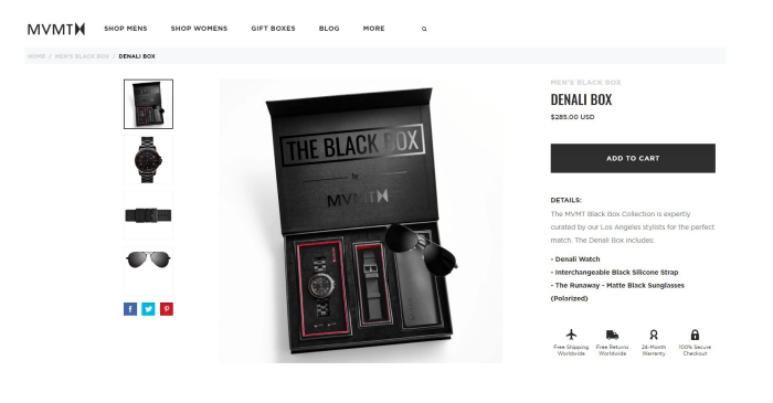 接下来,MVMT手表大师与时尚的礼盒捆绑。他们为他或她提供礼品盒。礼盒里有三样东西:一块手表、一条额外的表带和一副太阳镜。它们被包装在一个漂亮的黑盒子里。目前,所有的女性礼盒都已售罄。然而,有一个部分,你可以让MVMT在他们有空的时候给你发邮件。这样做的好处是,它允许品牌知道一个粗略的估计,他们需要订购多少库存,因为他们收到请求。