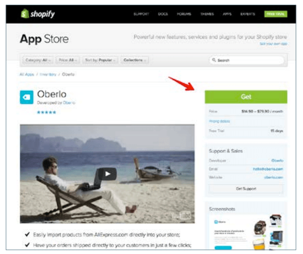 点击这里并在Shopify商店中安装免费的Oberlo试用版。