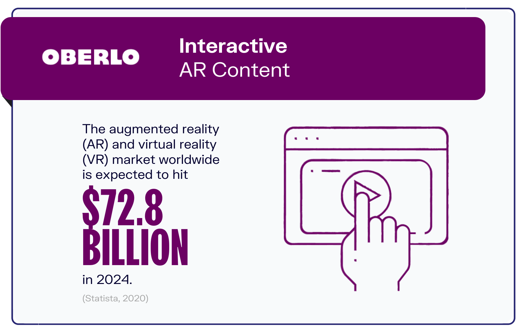 2022年最大的视频营销趋势列表中的下一个是增强现实(AR)和虚拟现实(VR)使用的增长。AR和VR市场预计将在未来几年内增长并达到728亿美元(Statista, 2020)。